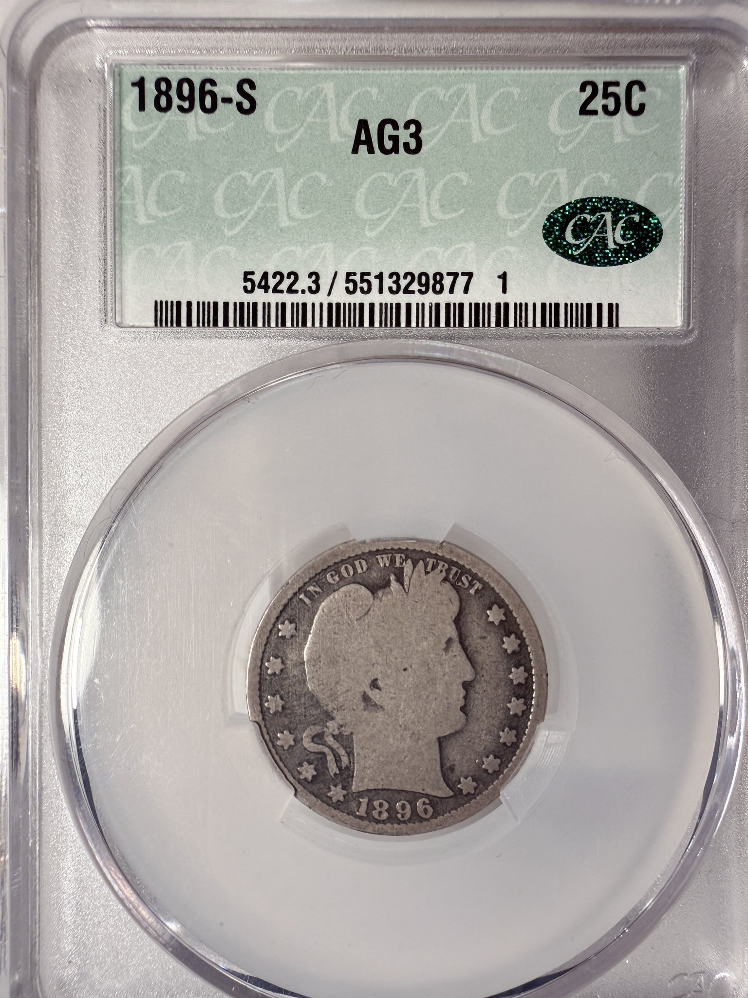 1896-S Barber Quarter AG3 CACG (13284) Key Date