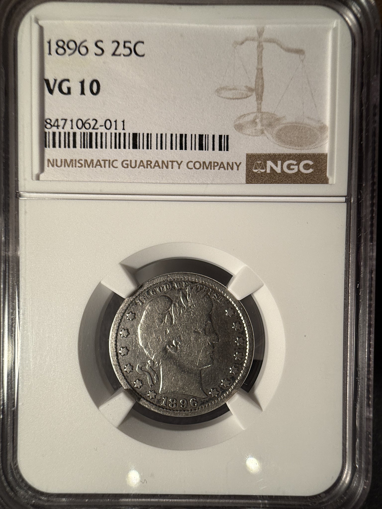 1896-S Barber Quarter, VG10 NGC, (14212)