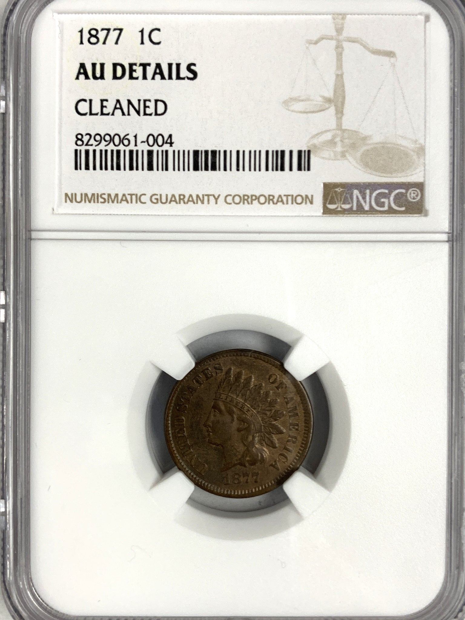 1877 Indian Head Cent, AU Det. NGC. Cleaned ( I don't see it)