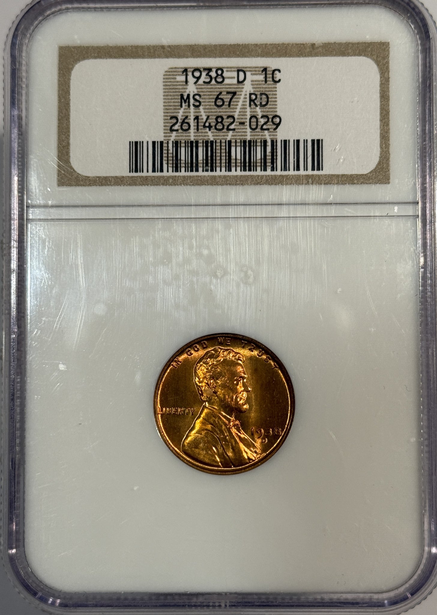 1938-D Lincoln Cent MS67RD NGC, (12544)