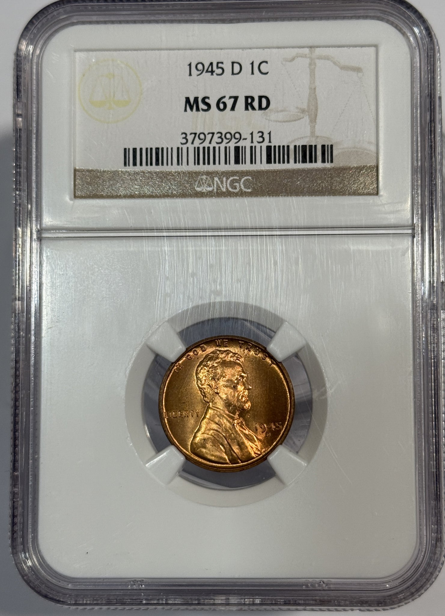1945-D Lincoln Cent MS67RD NGC, (12528)