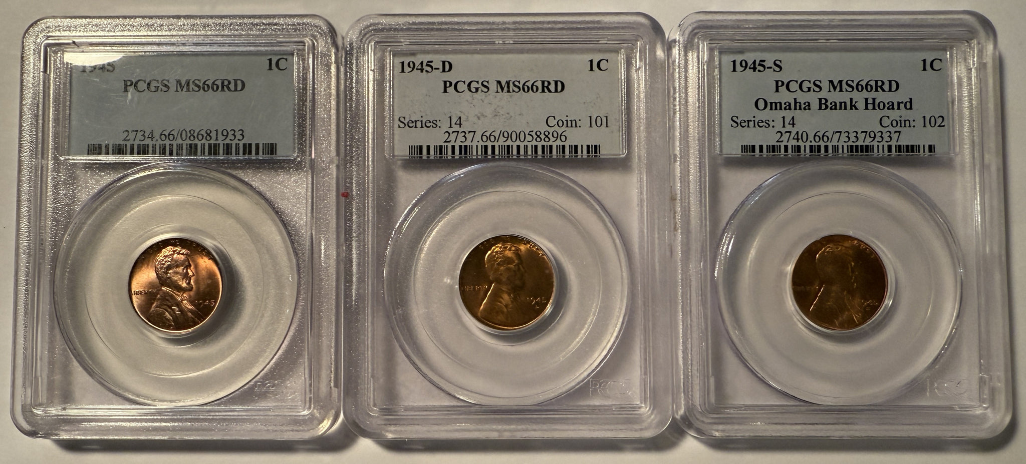 1945 P ,D ,S Lincoln Cents. MS66RD PCGS, (12654)
