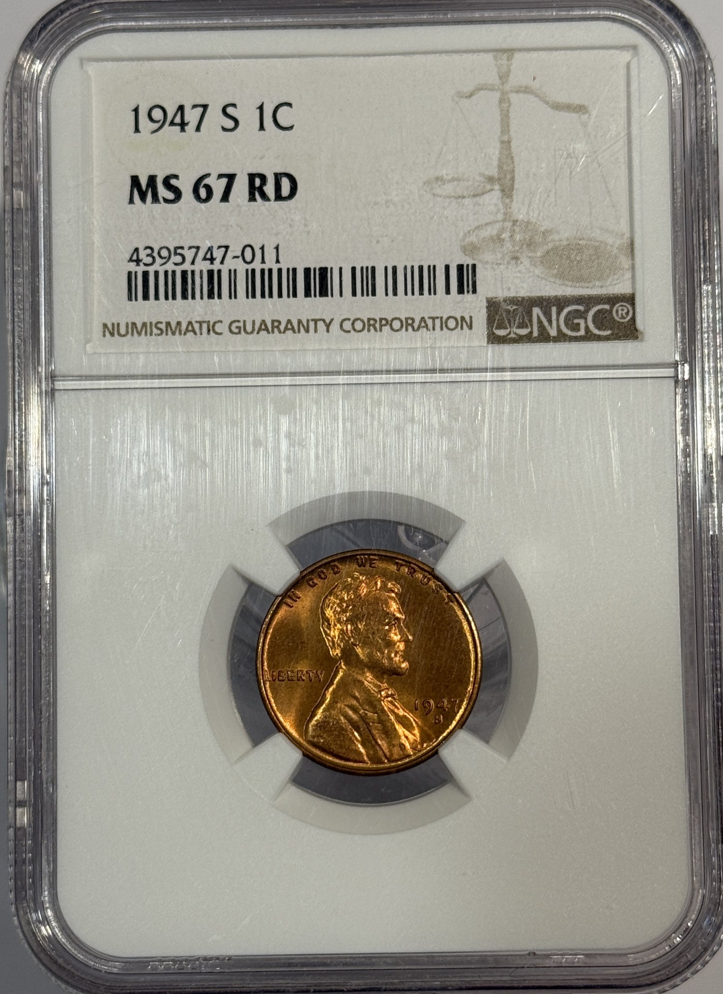 1947-S Lincoln Cent MS67RD NGC, (12522)