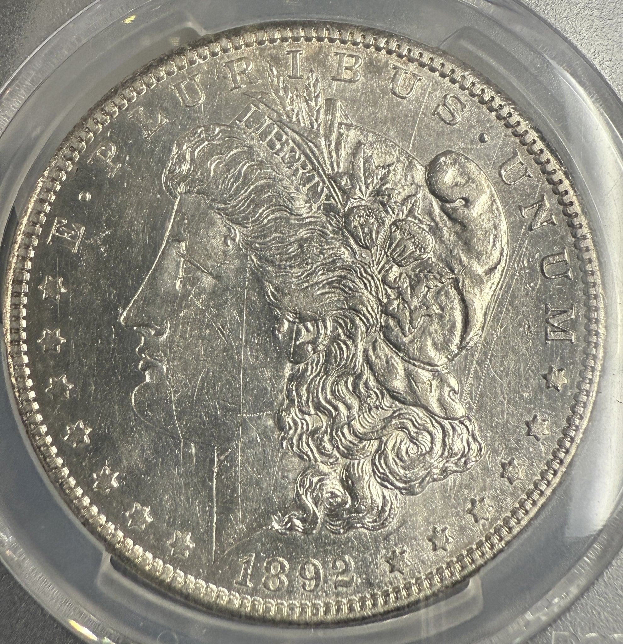 1892-S Morgan Silver Dollar, AU Detail, (Scratch) PCGS Gold Shield (10433), Great Eye Appeal. Scratch is really not distracting