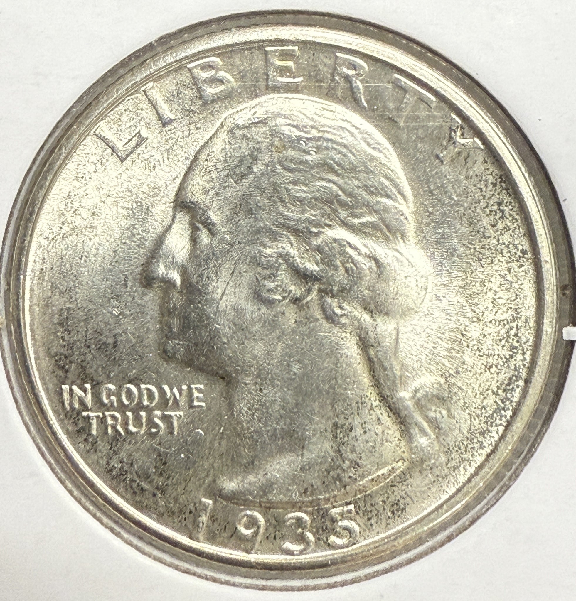 1935-D Washington Quarter, MS60+ (10892) Bright White Original Coin. Great Eye Appeal