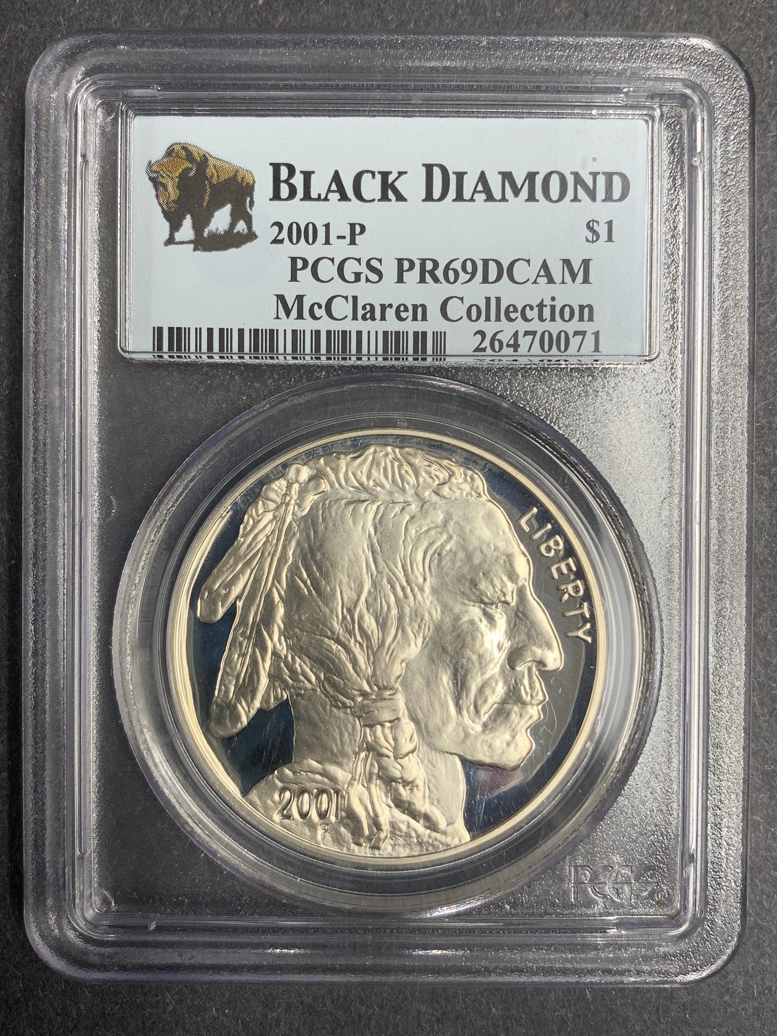 2001-P American Buffalo Silver Commemorative, PF69DCAM PCGS. Black Diamond, McClaren Collection Holder.