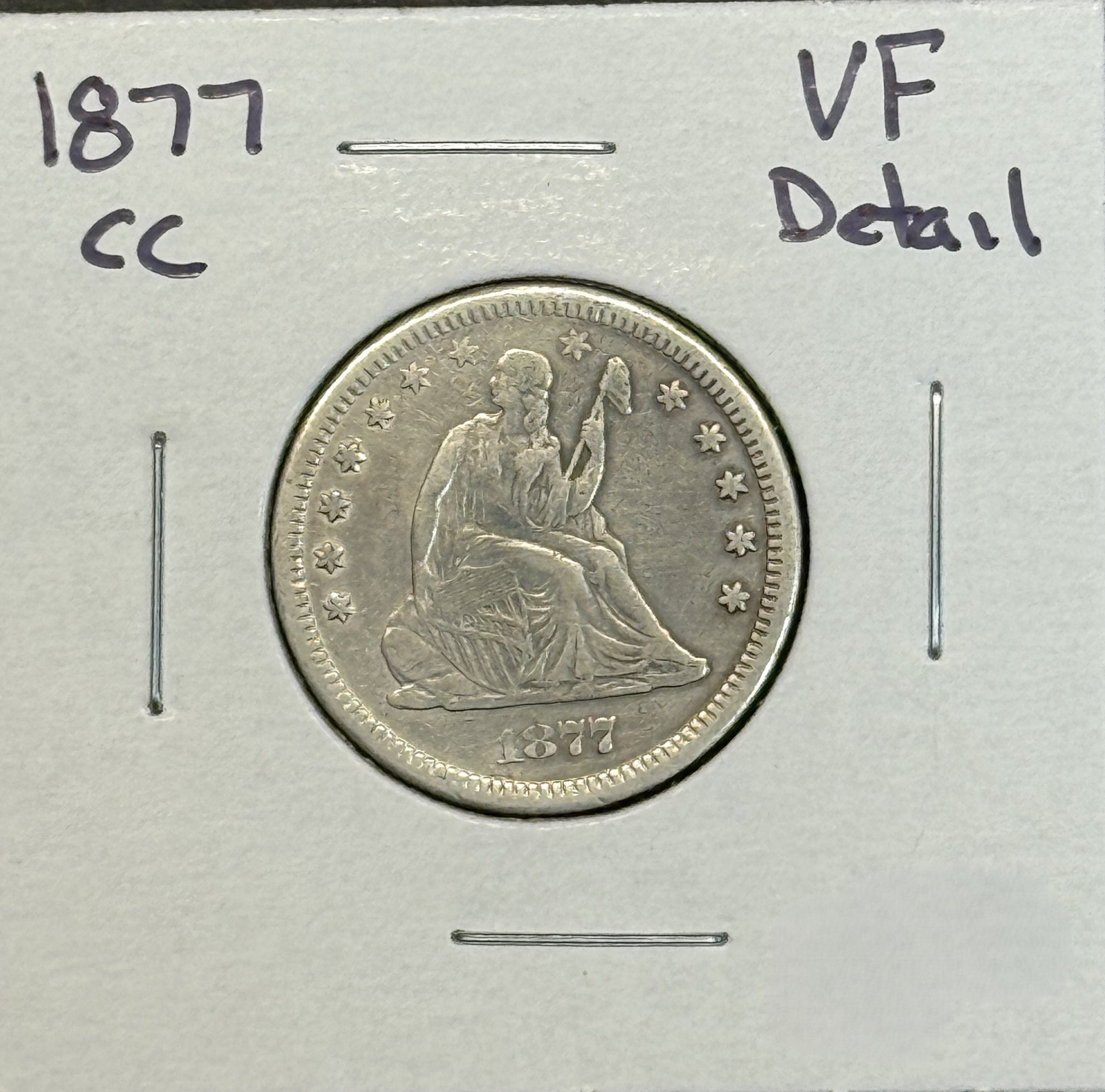 1877-CC Seated Liberty Quarter, VF Detail. (11454)