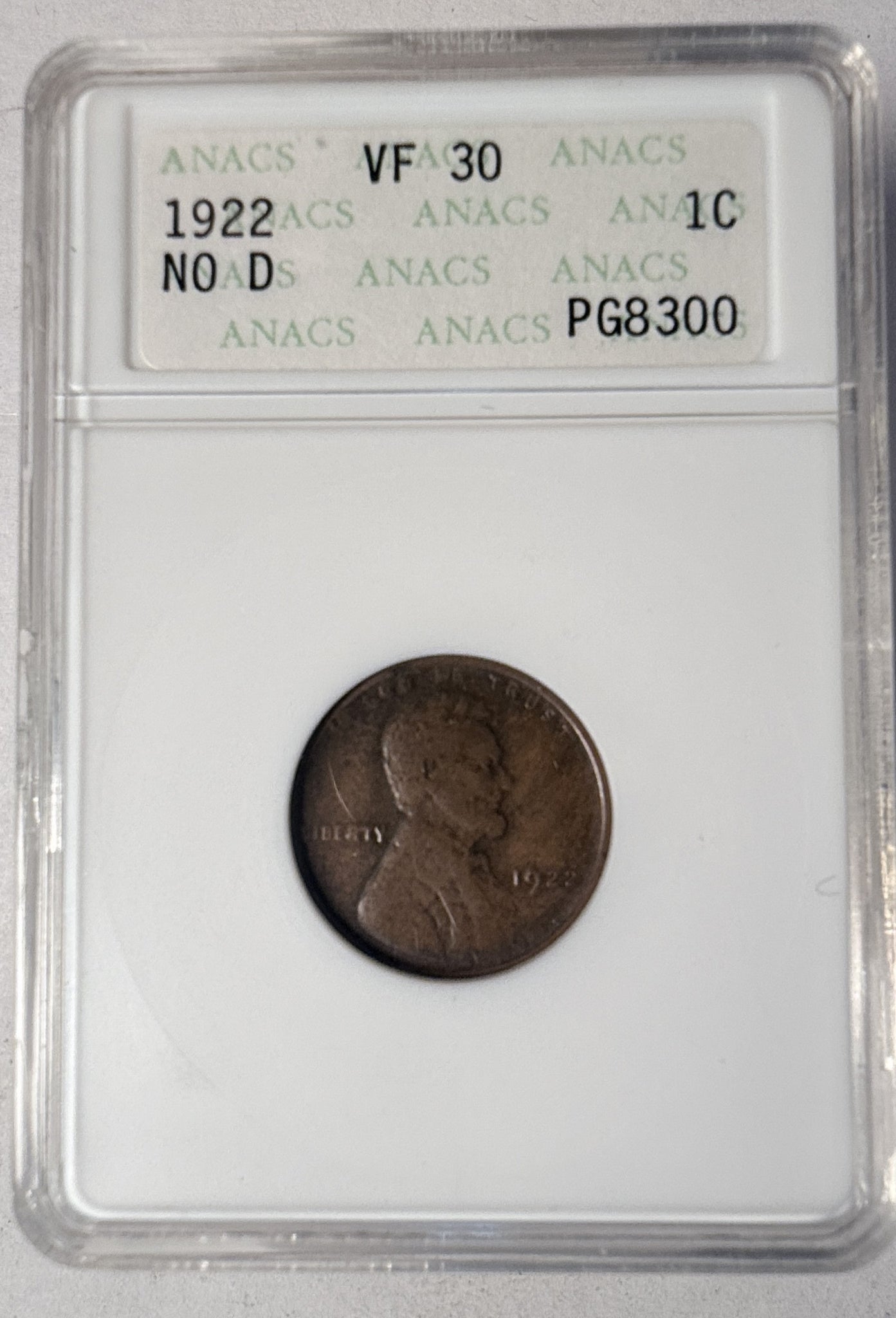 1922-P No D, Strong Reverse Lincoln Wheat Cent, VF30 ANACS. (13508)