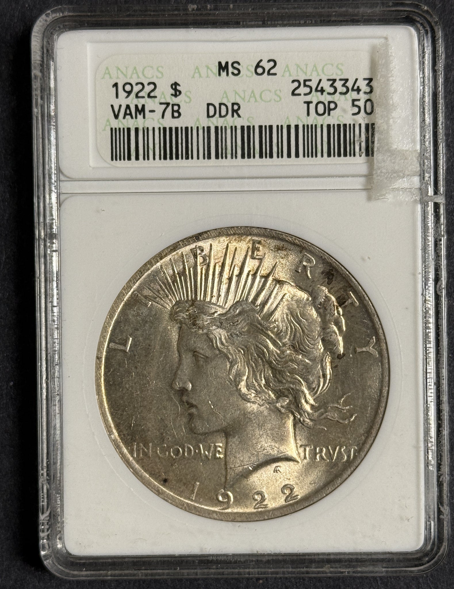 1922-S Peace Dollar, Mint Error ANACS MS62 (12411) VAM-7B DDR