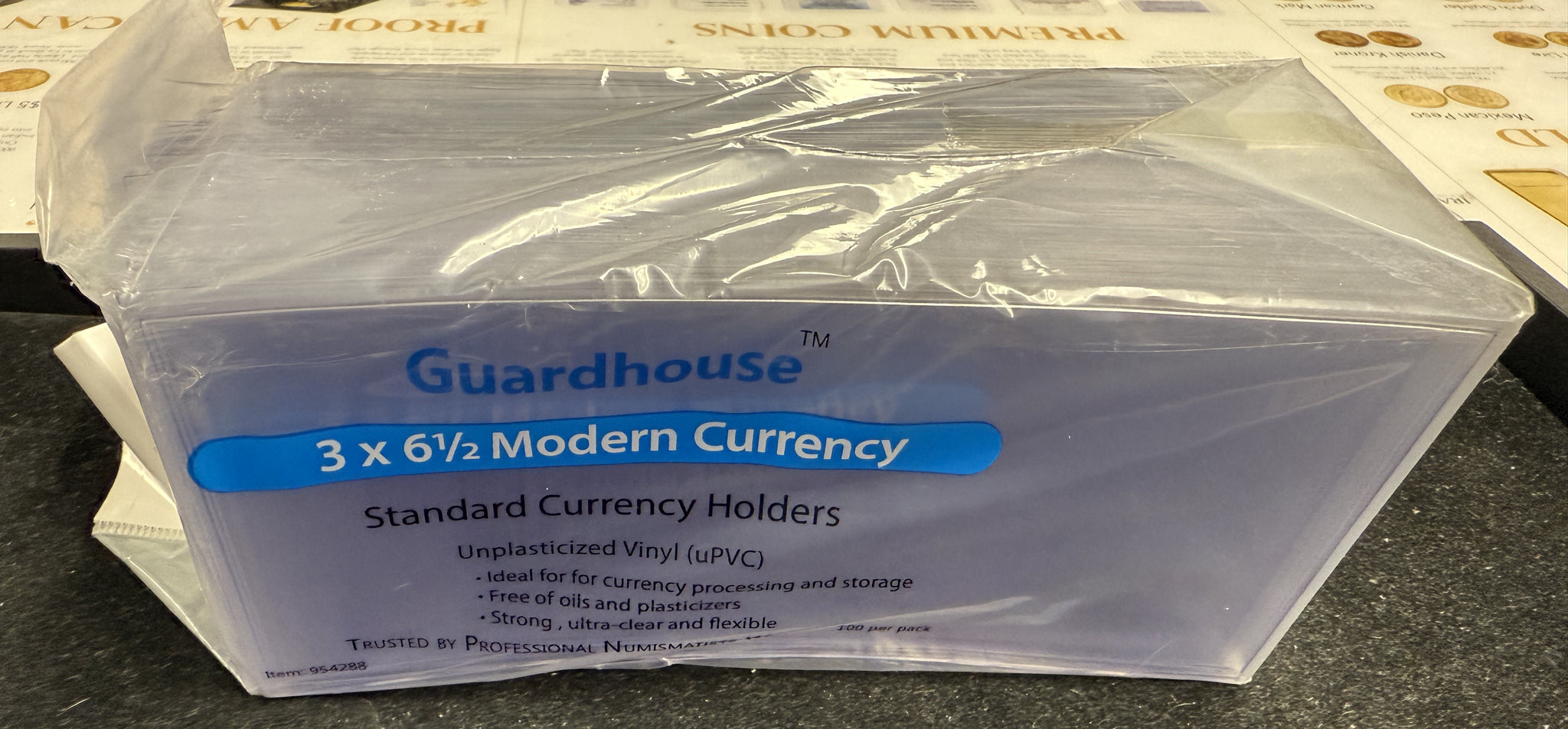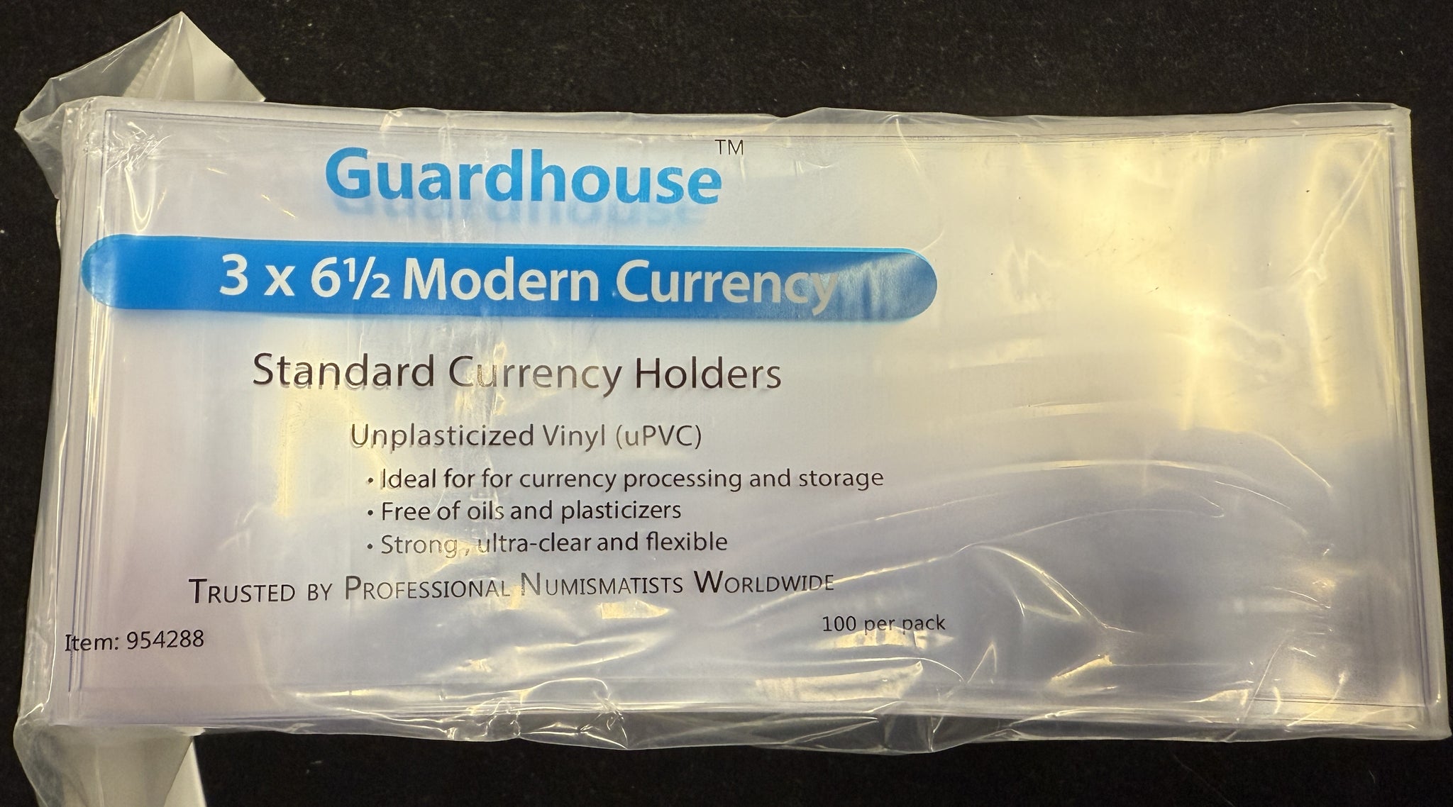 Guardhouse currency holders are high quality, 7 mil, double polished, unplasticized sleeves available in small, medium, large and European sizes. Guardhouse currency sleeves feature a 1/8 inch lip on the top to facilitate inserting bills into the holder. Small currency sleeves measure 5.25 x 3.125 inches. Medium currency sleeves measure 6.5 x 3 inches, and Large currency sleeves measure 8 x 3.5 inches. Currency holders come tightly packed and designed for an attractive POP peg board display with a resealable bag for easy access and storage.