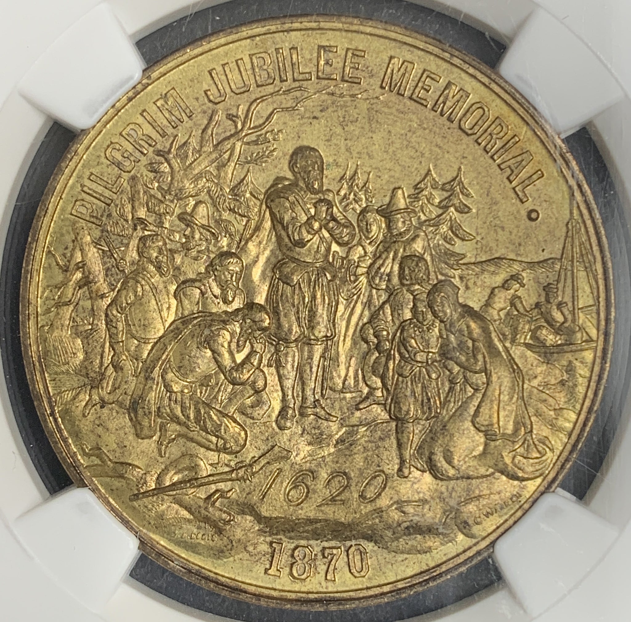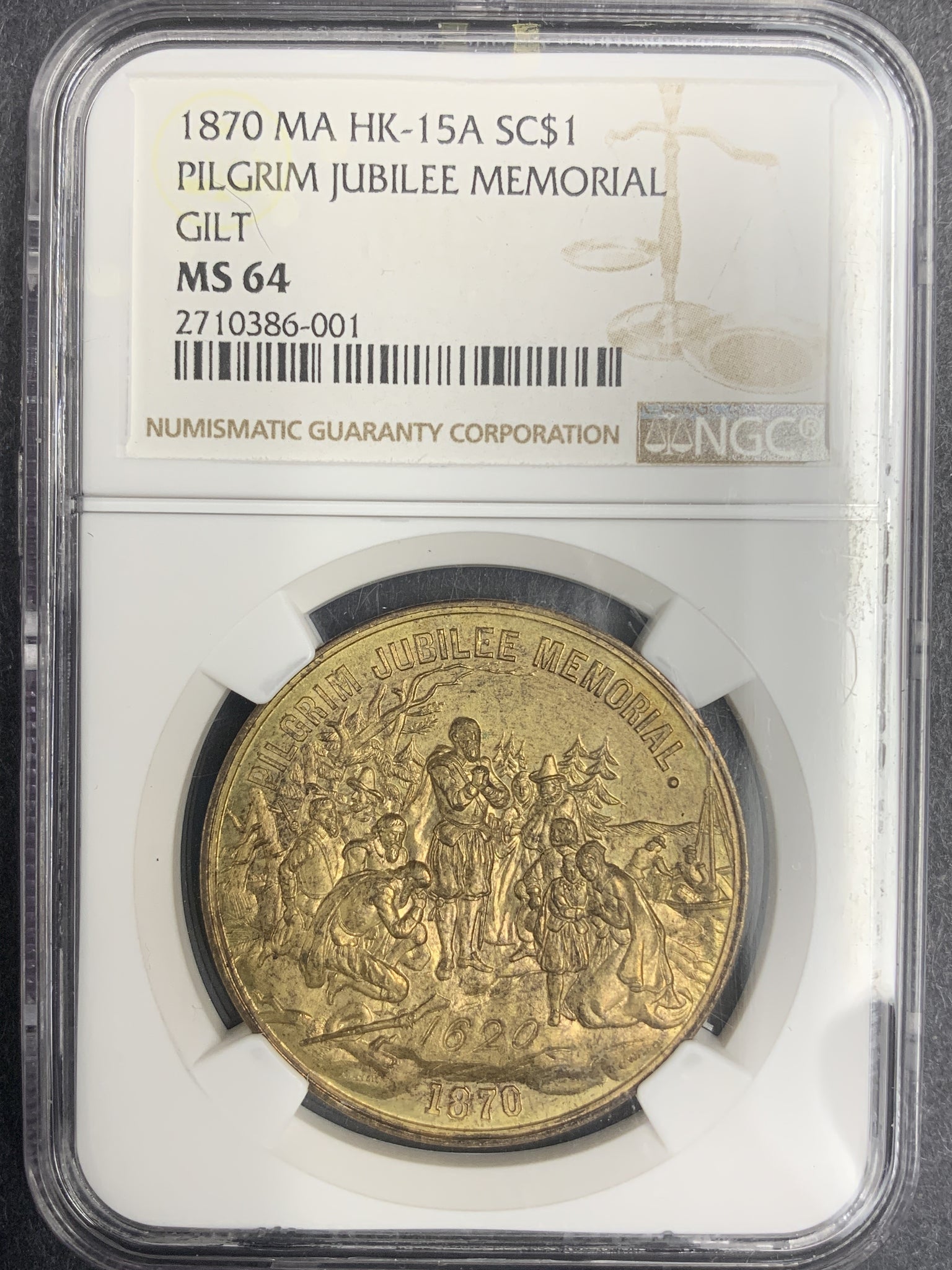 1870 MA HK-15A SC$1 Pilgrim Jubilee Memorial Gilt, NGC MS64