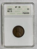 1922 NO D Lincoln Cent, Strong Rev. VF30 ANACS
