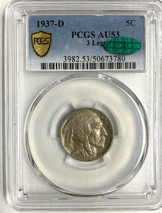 1937-D Buffalo Nickel, 3-Leg, AU53 PCGS, CAC
